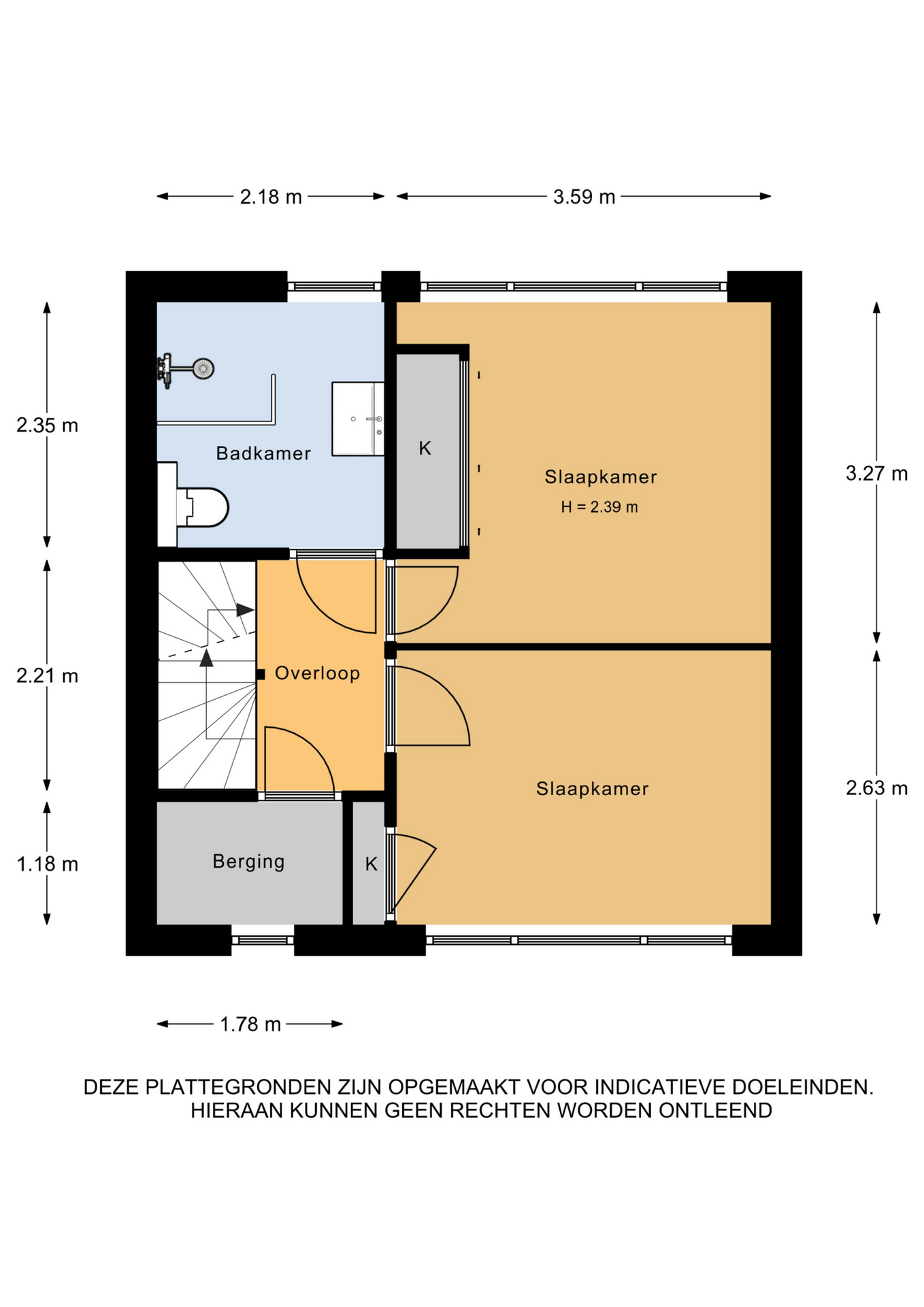1e Verdieping: overloop, badkamer met inloopdouche, toilet en wastafelmeubel, twee ruime slaapkamers met vaste/ inbouwkasten, inloopberging (voormalige badkamer).