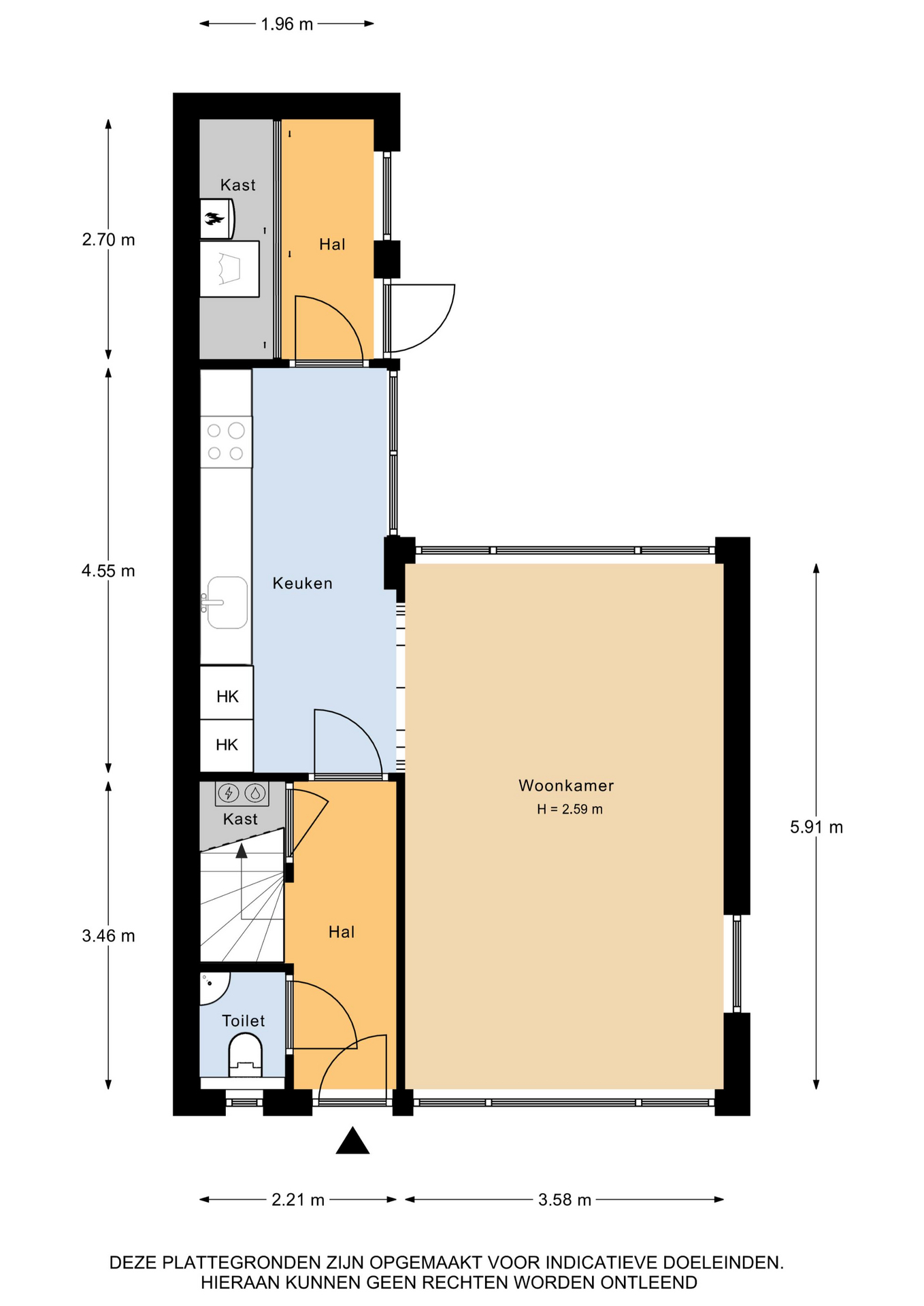 Begane grond: entree/ hal met toilet, trapopgang, trapkast met meterkast – toegang tot de woonkamer en keuken met daarachter de bijkeuken met inbouwkast met wasmachine-/droger aansluiting en CV-opstelling.
