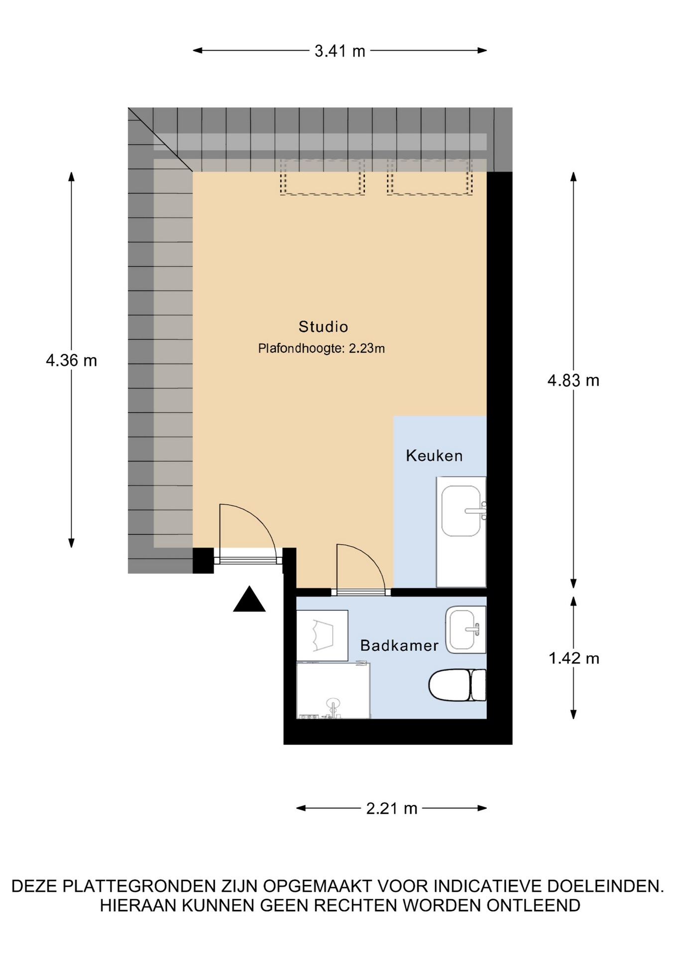 Je bereikt het appartement op de 1e verdieping via de trap en gezamenlijke entree. De afgesloten berging op de begane grond deel je met 4 andere studio’s.