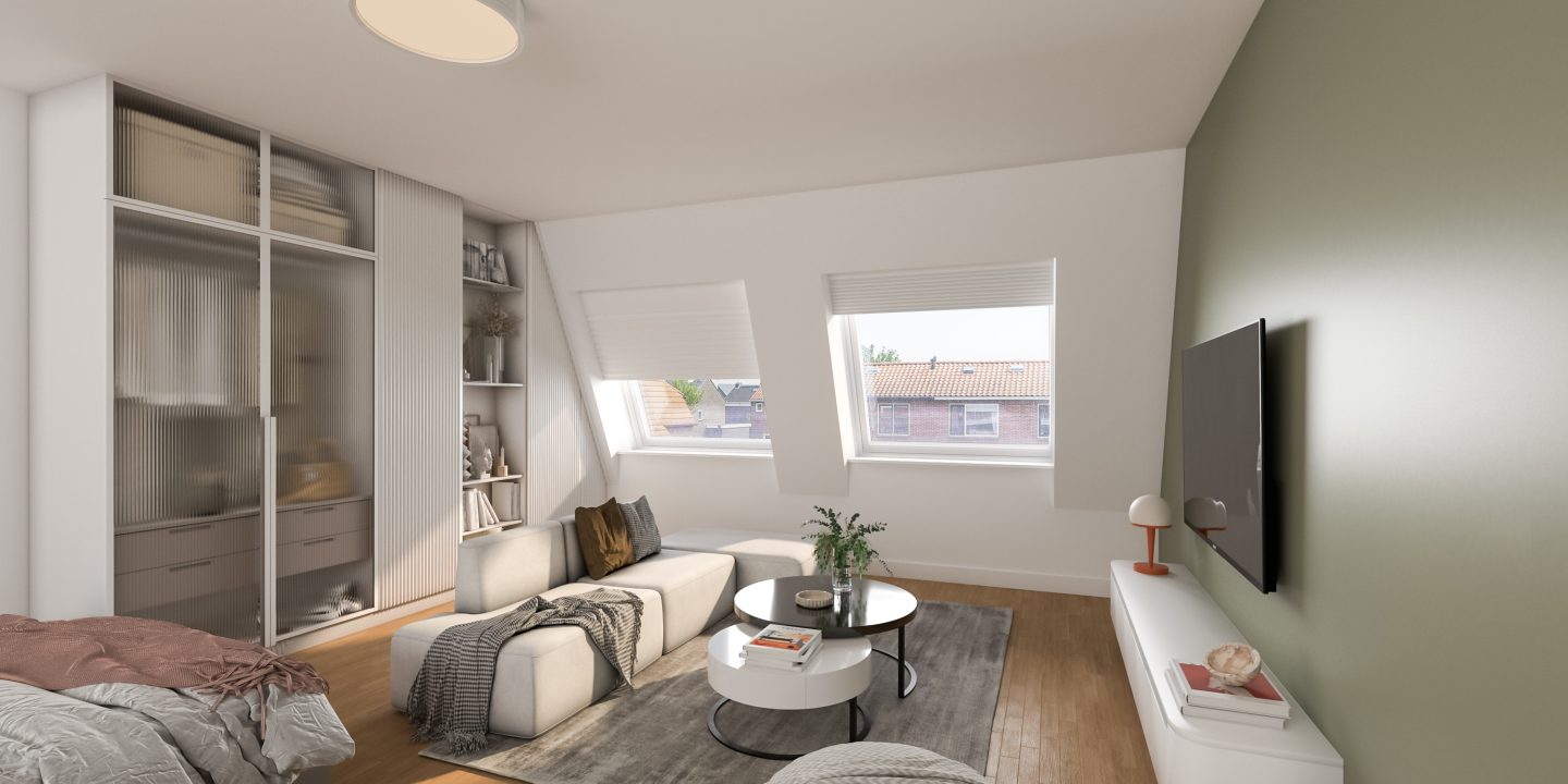 Je bereikt het appartement op de 1e verdieping via de trap en gezamenlijke entree. De afgesloten berging op de begane grond deel je met 4 andere studio’s.