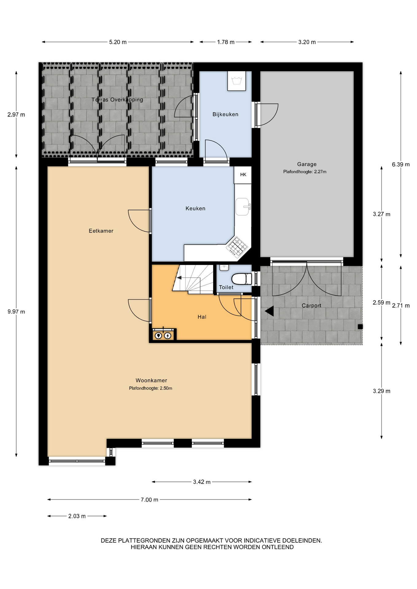 Begane grond: entree/ hal – toilet – L-vormige woonkamer met openslaande deuren naar het overdekte terras – dichte keuken met ruimte voor een eethoek – bijkeuken met wasmachine aansluiting – toegang tot de garage met dubbele deuren en achteringang.