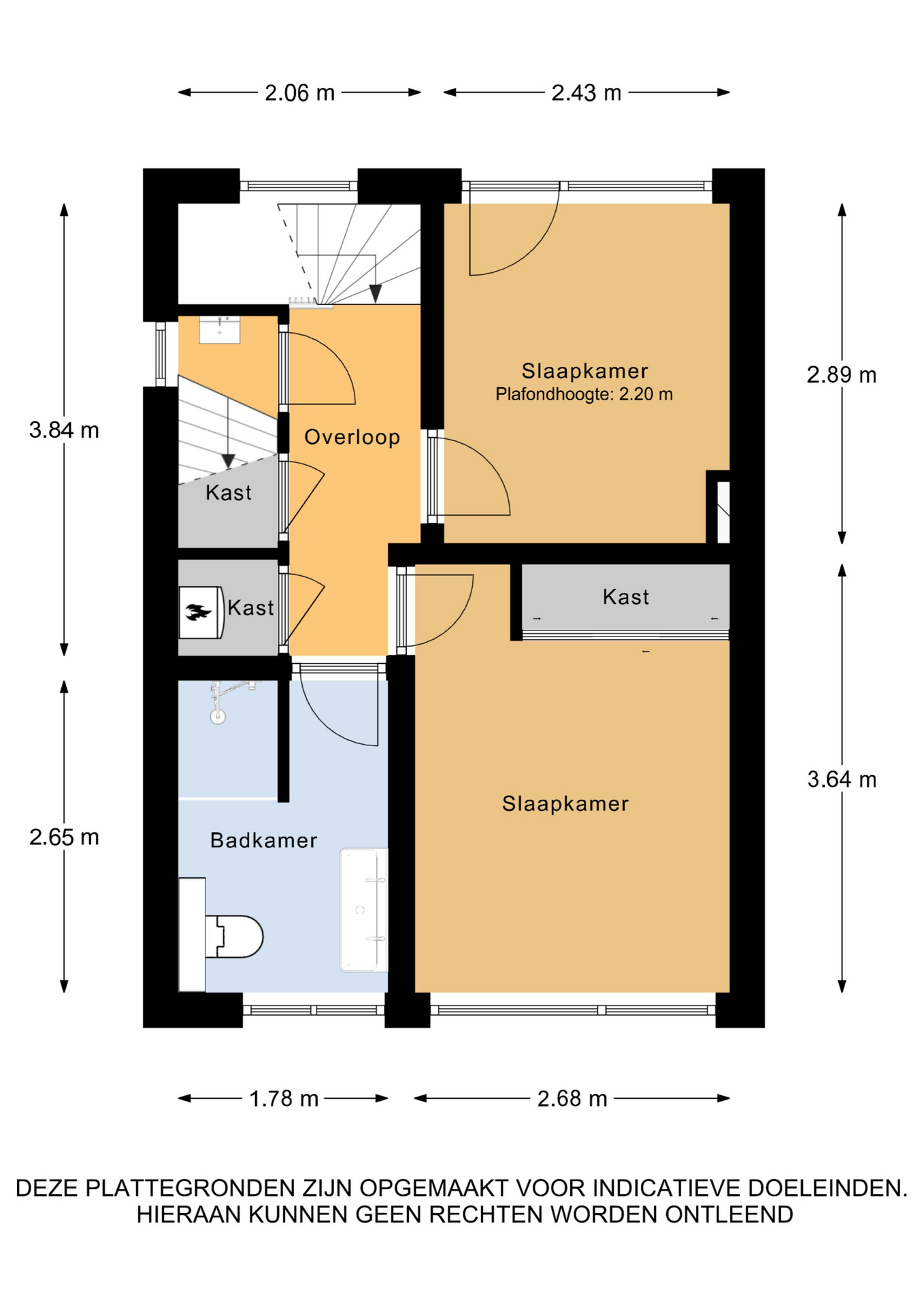 1e Verdieping: overloop – vaste kast en tweede vaste kast met opstelling CV-combiketel – twee slaapkamers – badkamer met wastafelmeubel met dubbele kom, douchehoek met sunshower, toilet – trapopgang naar 2e verdieping.