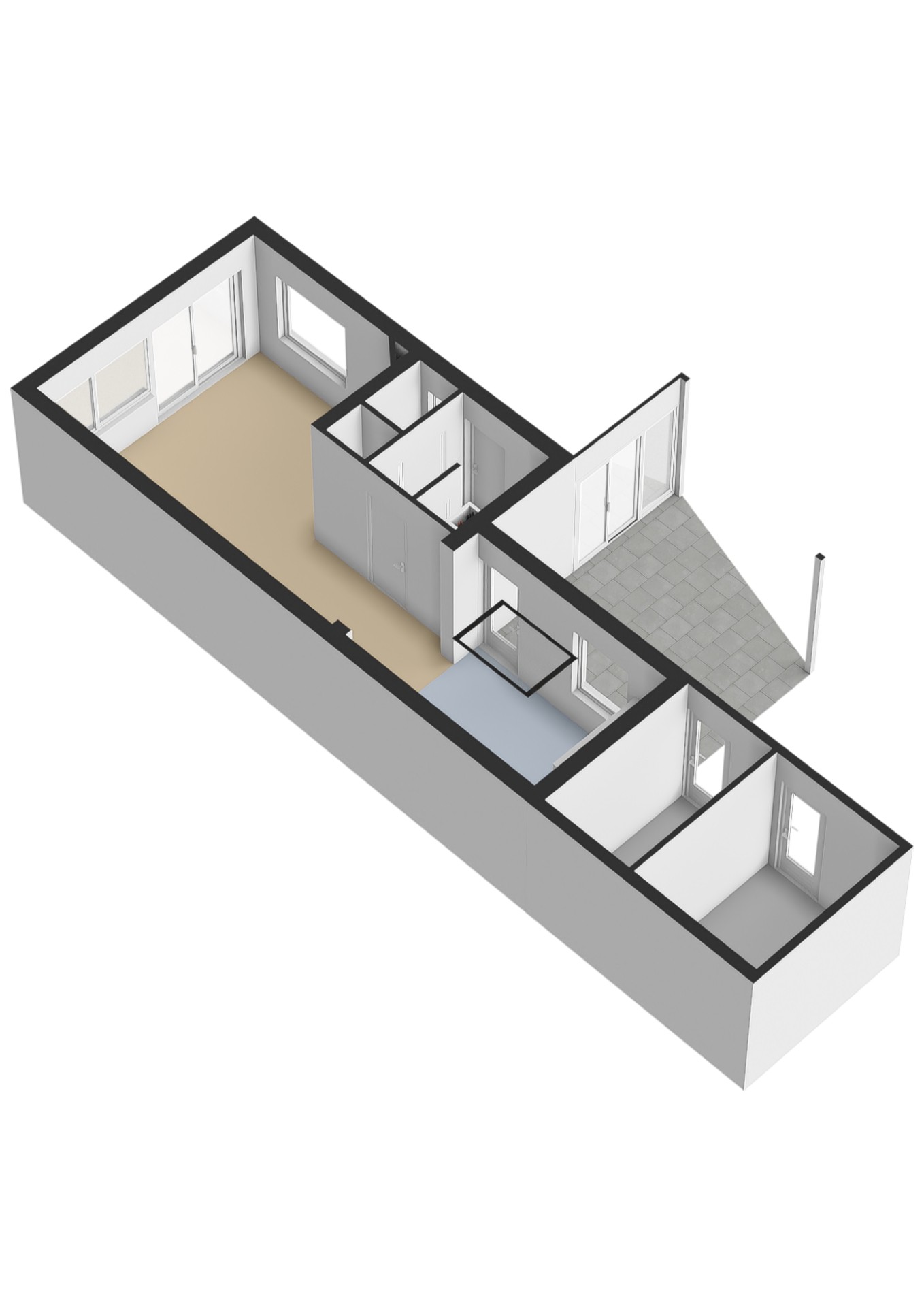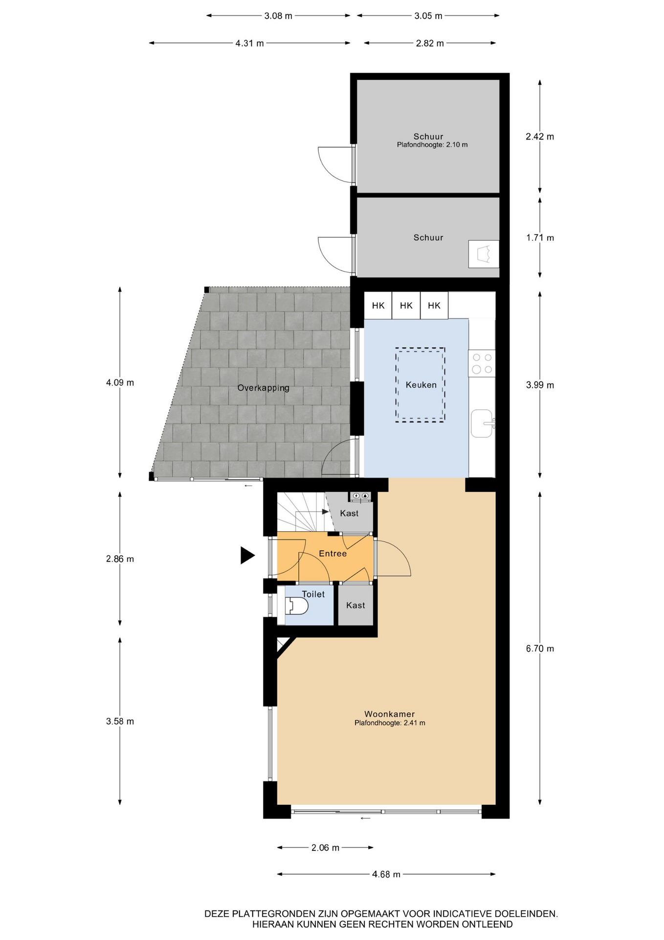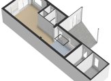 Begane grond: entree/ hal – trapopgang – trap-/ provisiekast – toilet – woonkamer met open keuken en achteringang.