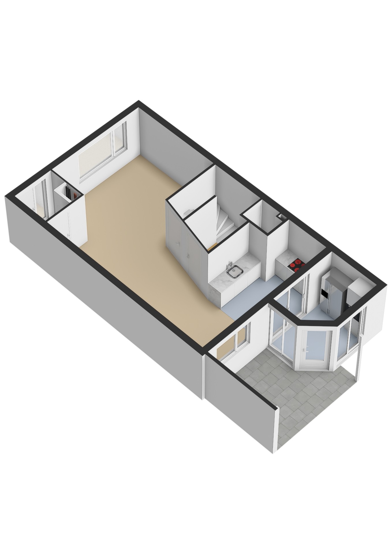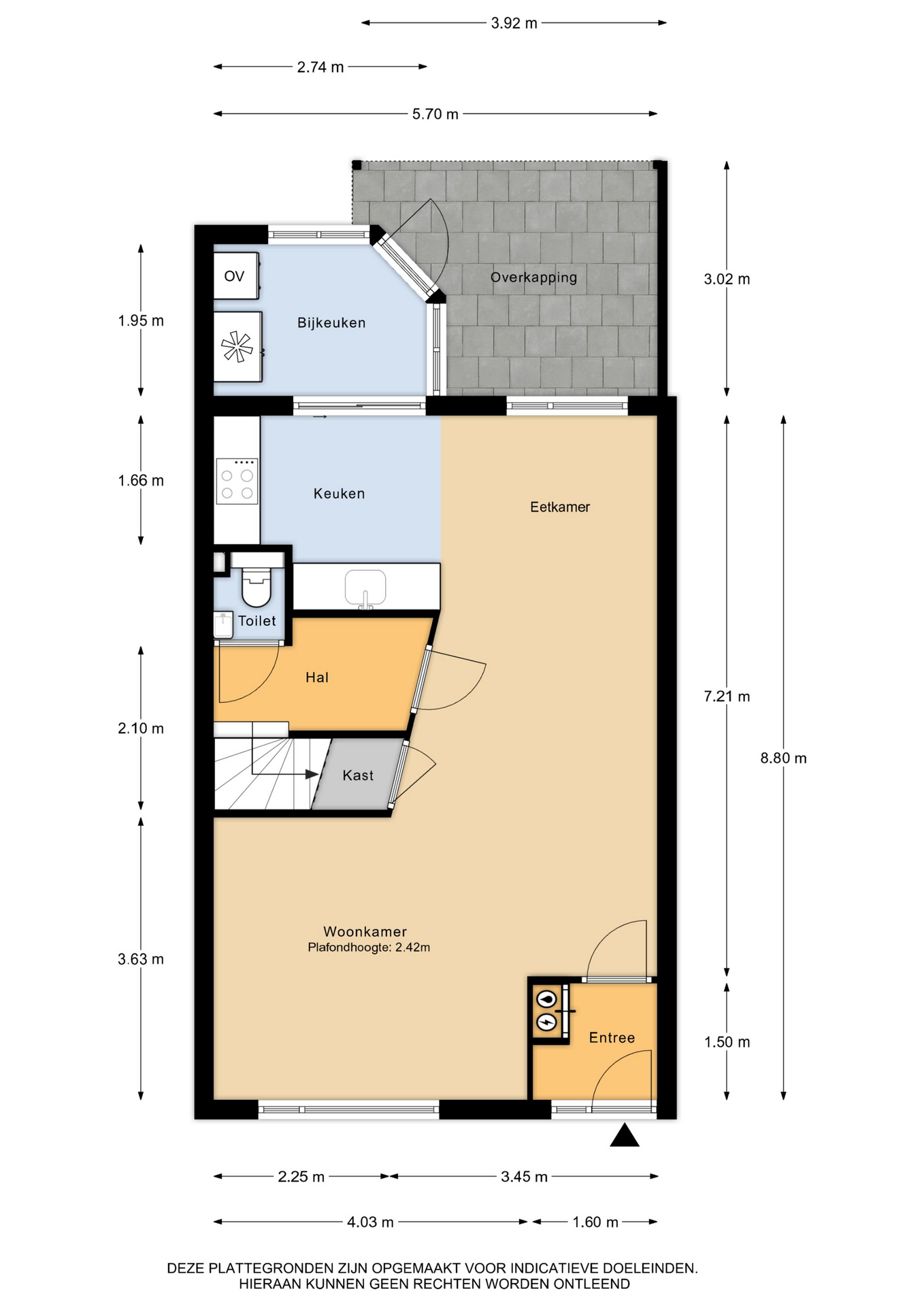Begane grond: entree/ hal met meterkast – woonkamer met kastenwand – provisiekast – tussenhal met toilet en trapopgang – open keuken – bijkeuken.