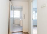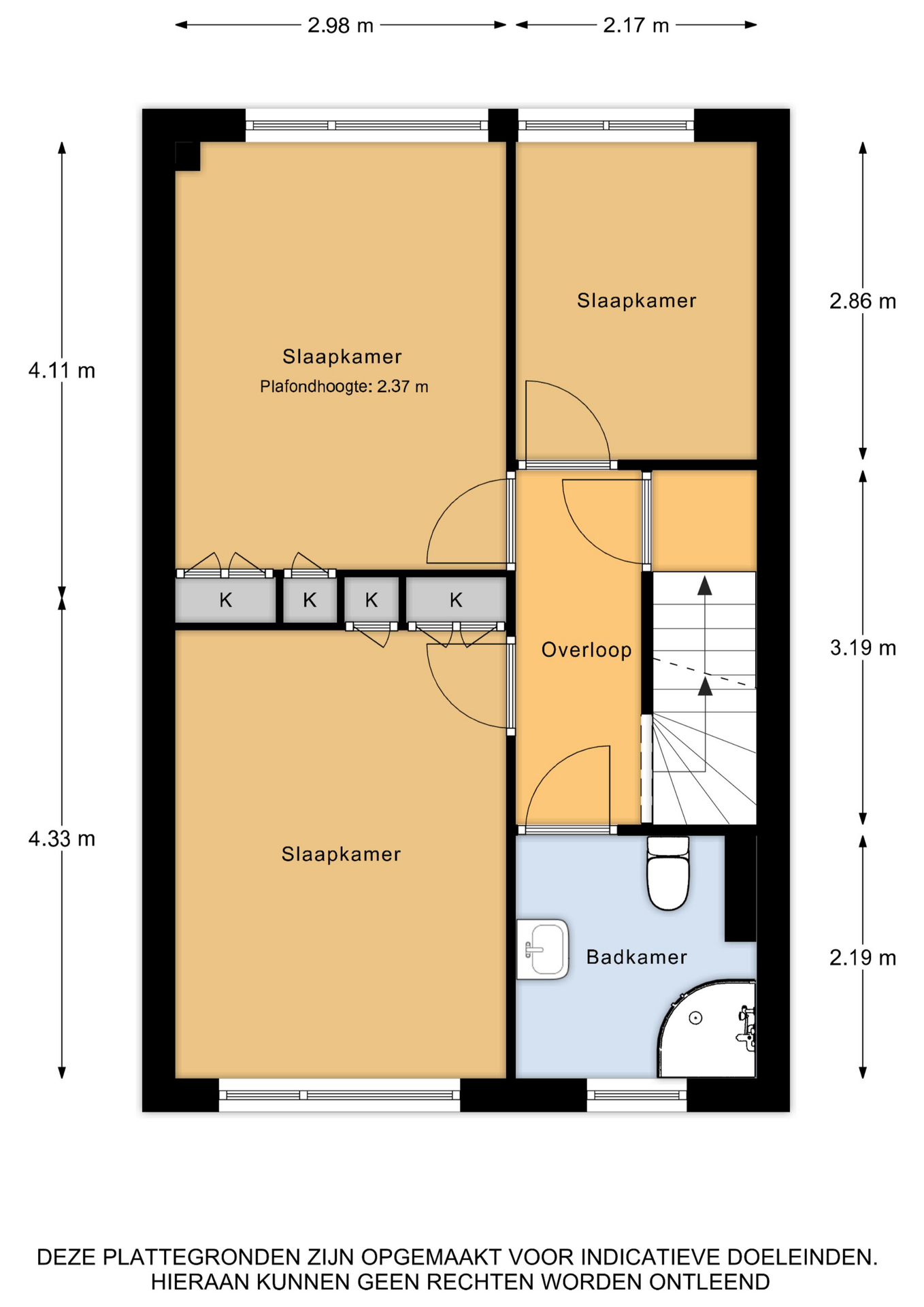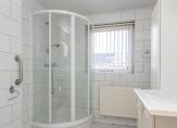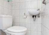Overloop – drie slaapkamers, waarvan één met inbouwkast – badkamer met douchecabine, toilet en wastafelmeubel met wastafel.