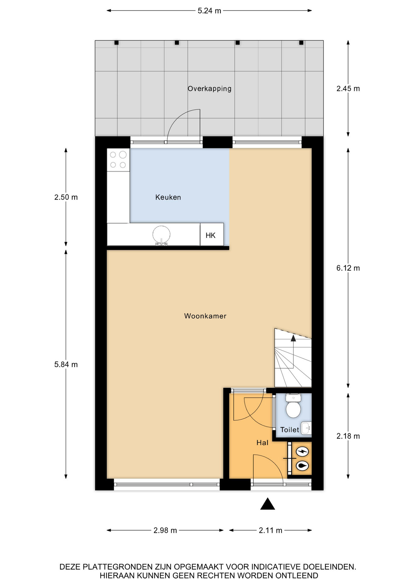 Entree/ hal met meterkast – woonkamer met trapopgang naar de 1e verdieping – open keuken met een keukenopstelling met o.a. een vaatwasser, koelkast, keramische kookplaat, afzuigkap en combioven – achteringang.