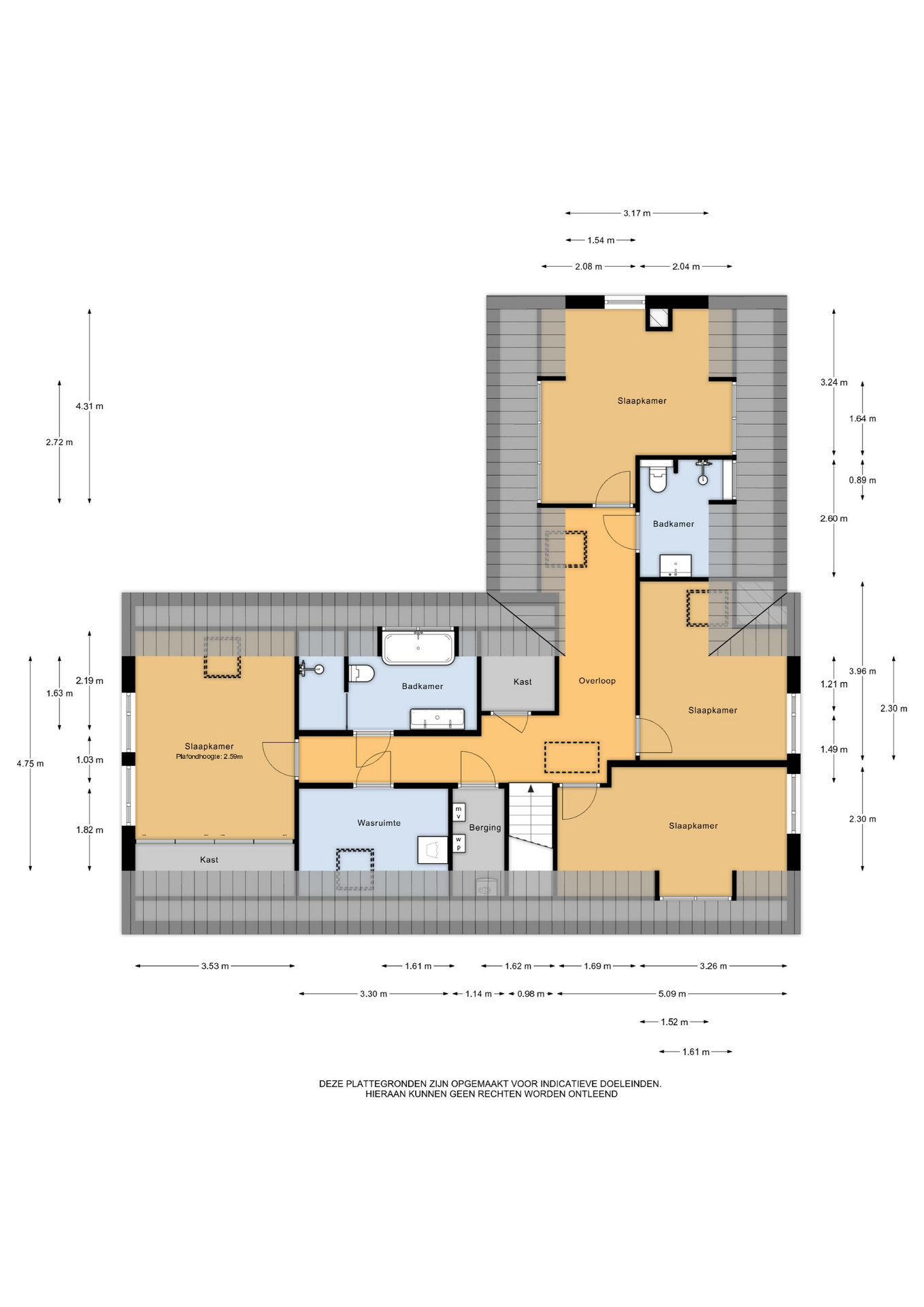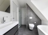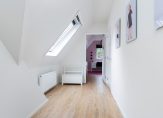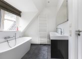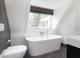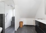 Eerste verdieping: overloop – bergkast in gebruik als stookruimte en tweede bergkast – slaapkamer met dakkapel – slaapkamer – badkamer met douche, toilet en wastafelmeubel – slaapkamer met dakkapel – studeer-/ waskamer met wasmachine aansluiting – badkamer met ligbad, wastafelmeubel met dubbele kraan, toilet en douchecabine – masterbedroom met vaste kasten.