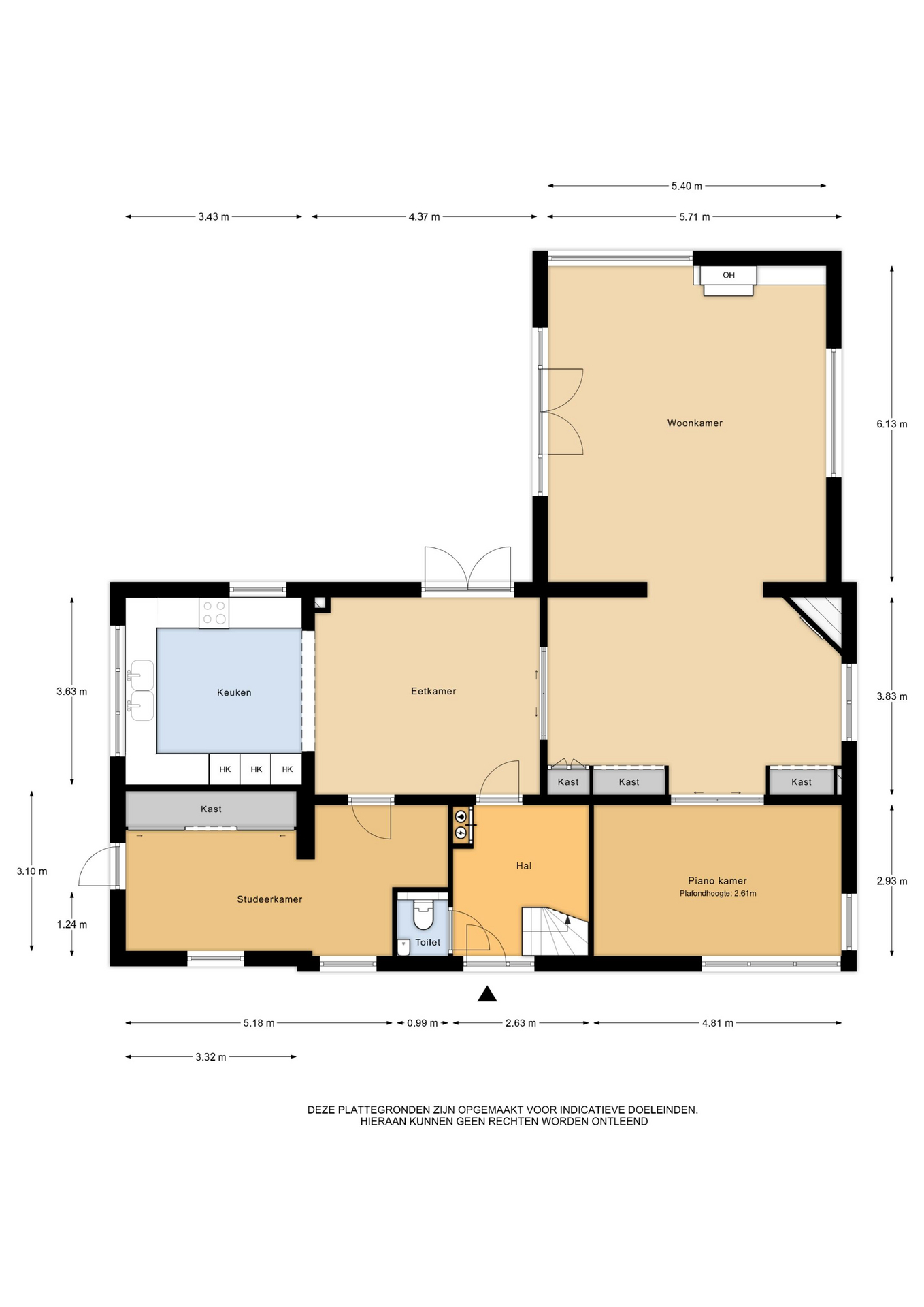 Begane grond: entree/ hal – trap – toilet – woonkamer met toegang tot het terras en de tuin middels de openslaande deuren – ensuite deuren naar de muziekkamer – woonkeuken met openslaande deuren naar het terras – studeer-/ werk of speelkamer met vaste kastenwanden en achteringang.