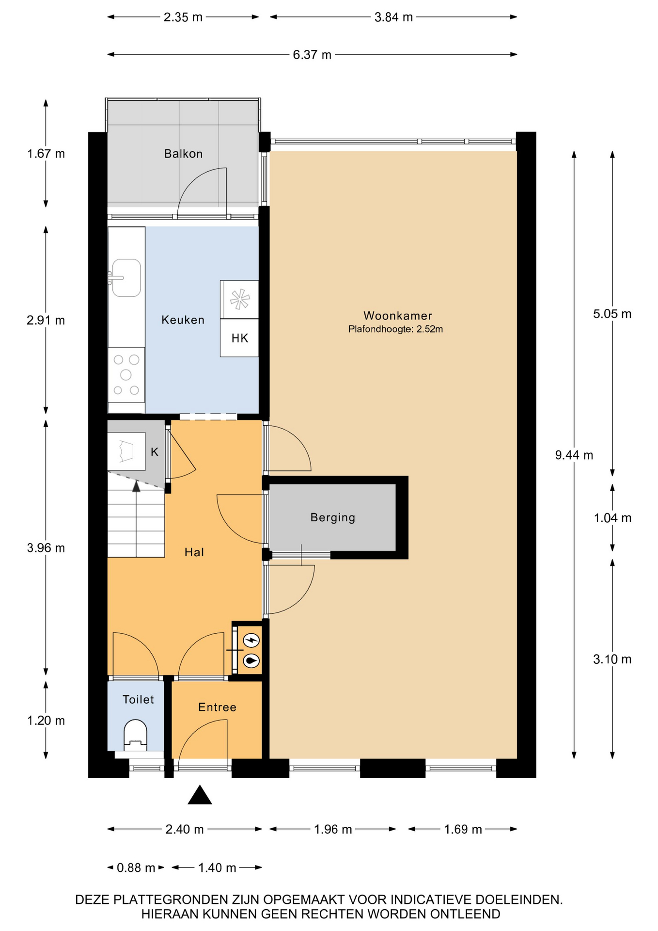 1e Verdieping appartement: entree/ hal met garderobe – gang – toilet – trapopgang verdieping – trapkast met wasmachine-aansluiting – inloop provisiekast – eetkamer – woonkamer – keuken – balkon.
