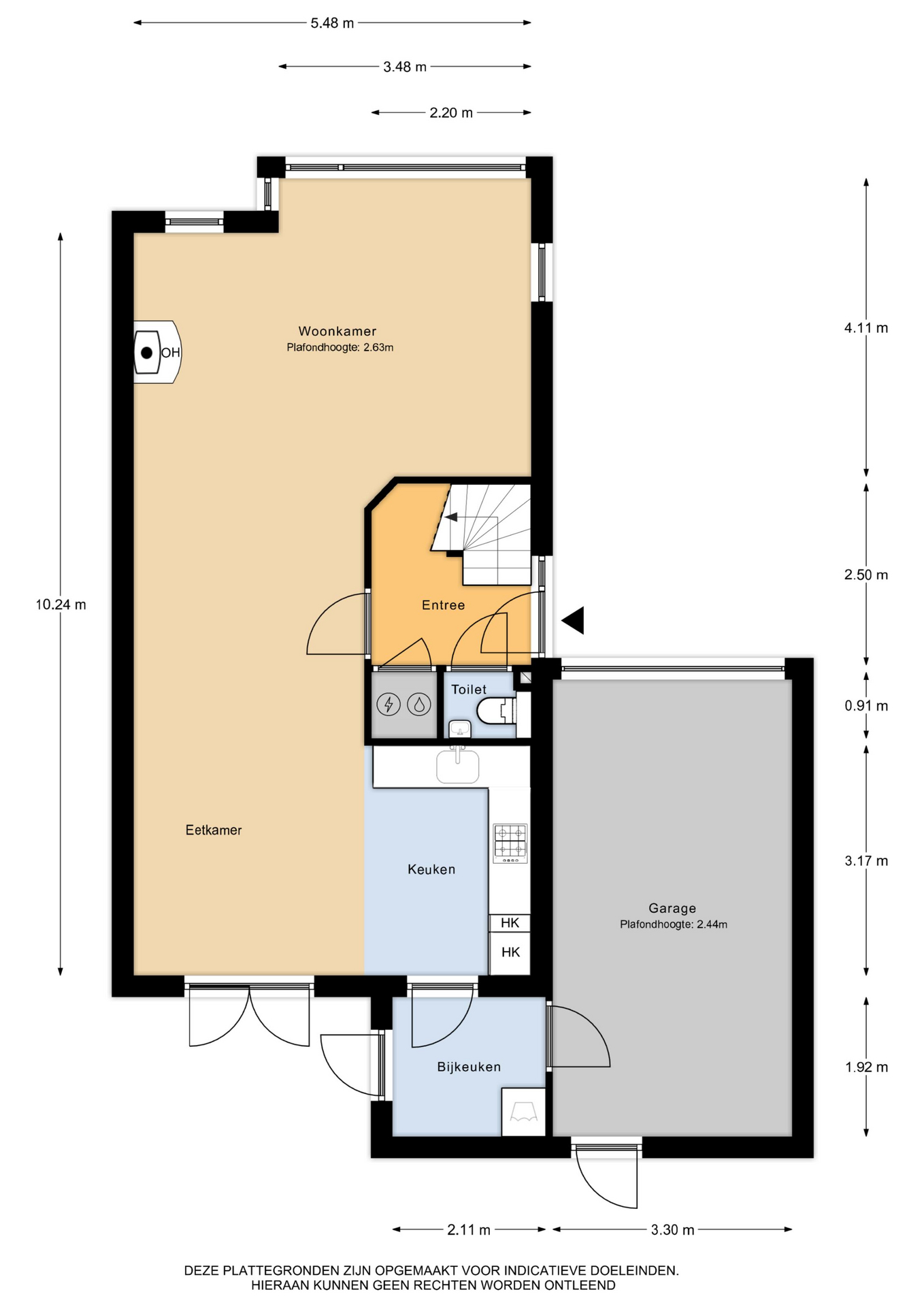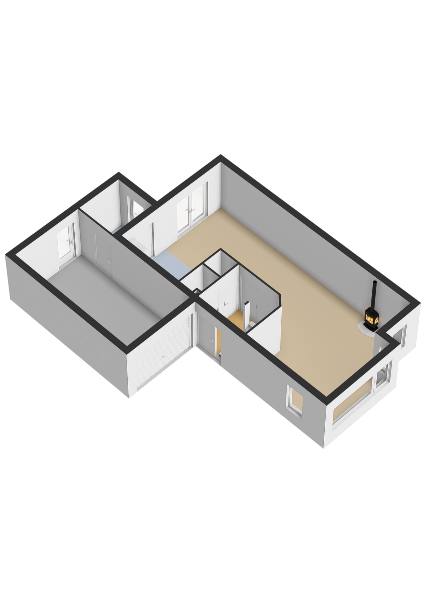 Begane grond: entree/ hal – toilet met fonteintje – ruime woonkamer met erker aan de voorzijde, houtkachel en openslaande deuren aan de achterzijde – open keuken met vaatwasser, gaskookplaat, afzuigkap, koelkast en vriezer, oven – bijkeuken met wasmachine aansluiting – toegang tot de garage met kantel- en loopdeur en achteringang.