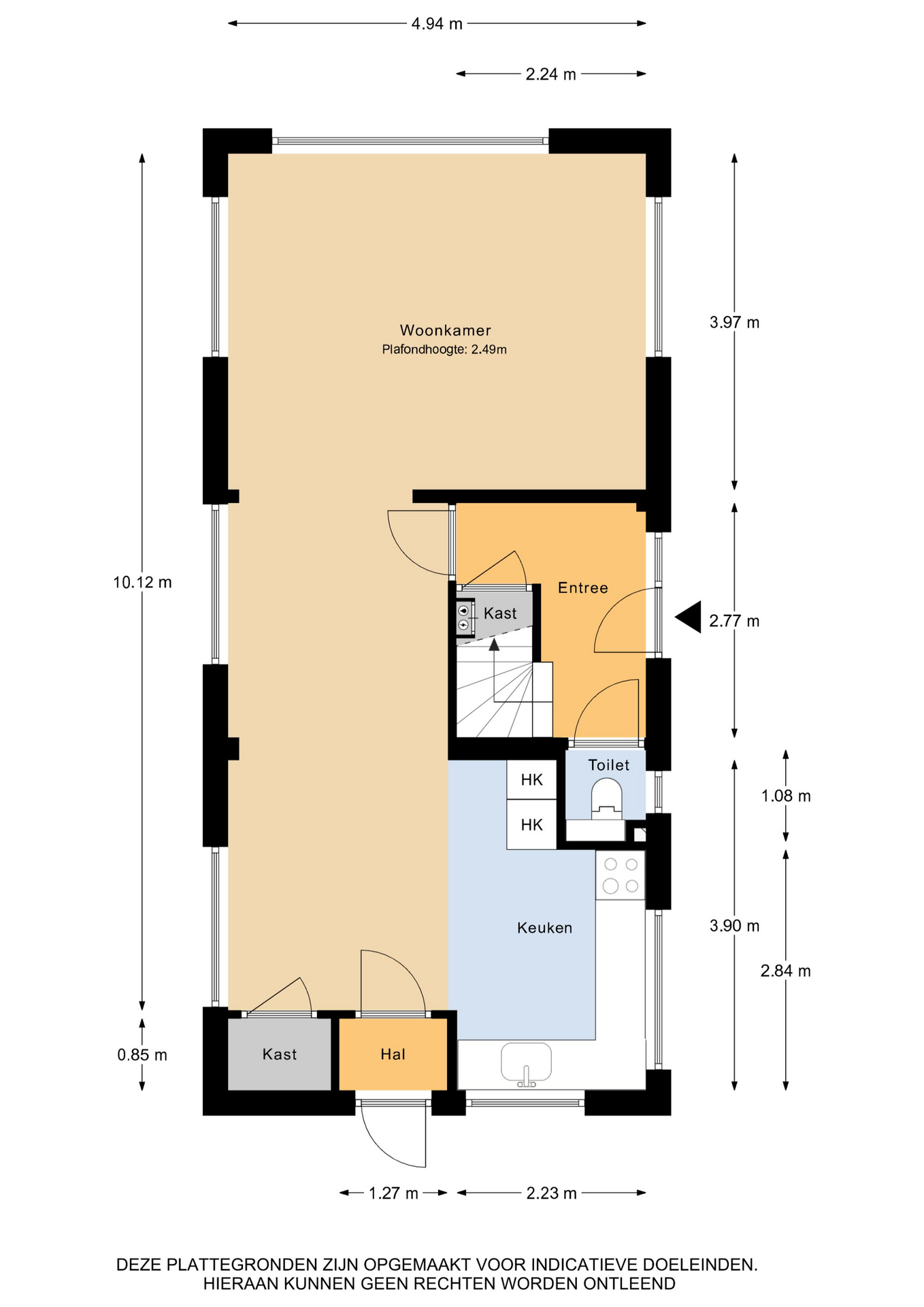 Begane grond: entree/ hal – toilet – trapopgang – woonkamer – open keuken met provisiekast – bijkeuken. De keuken uit 2020 is voorzien van een vaatwasser, koelkast met vriezer, inductiekookplaat en afzuigkap en combimagnetron.