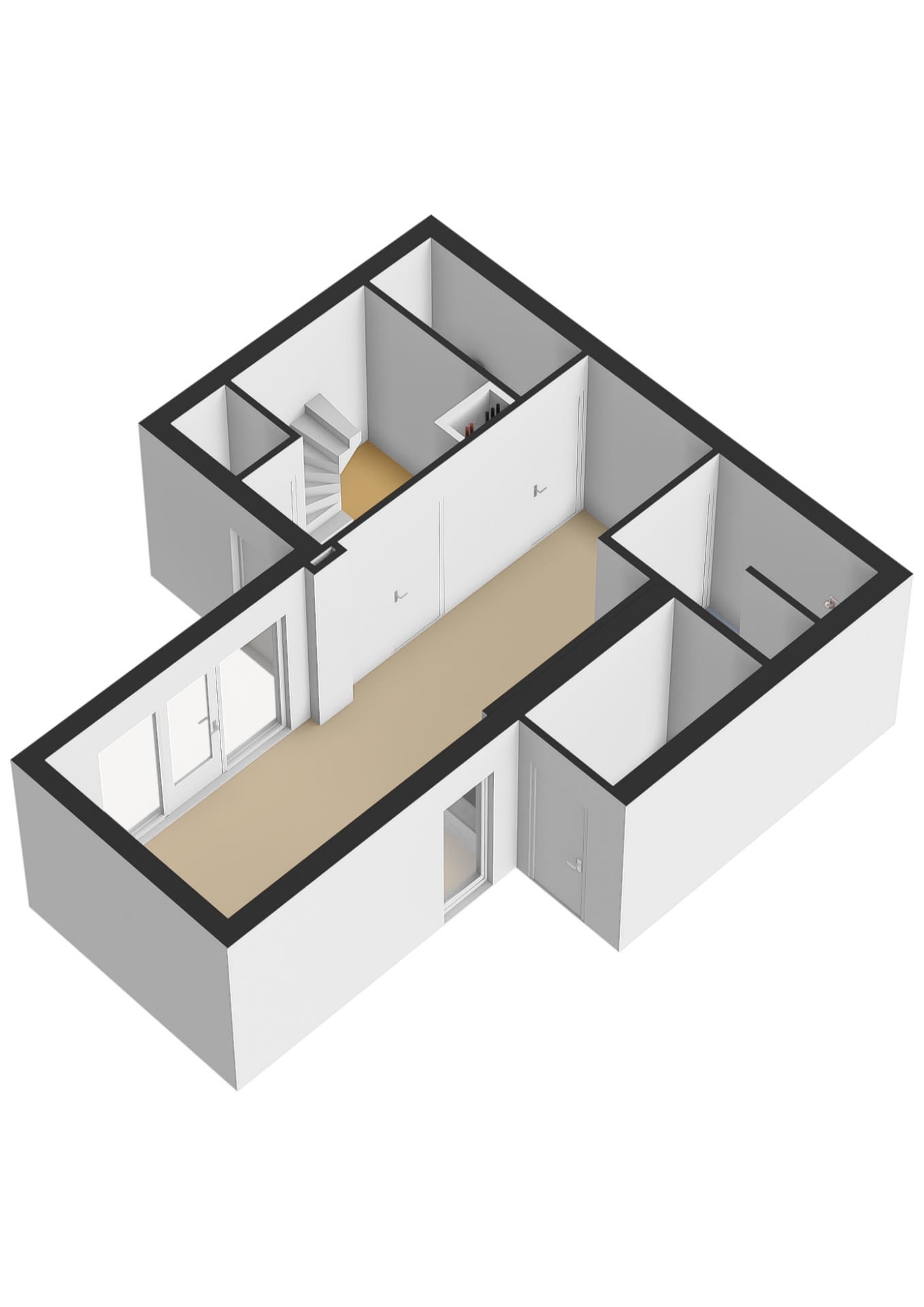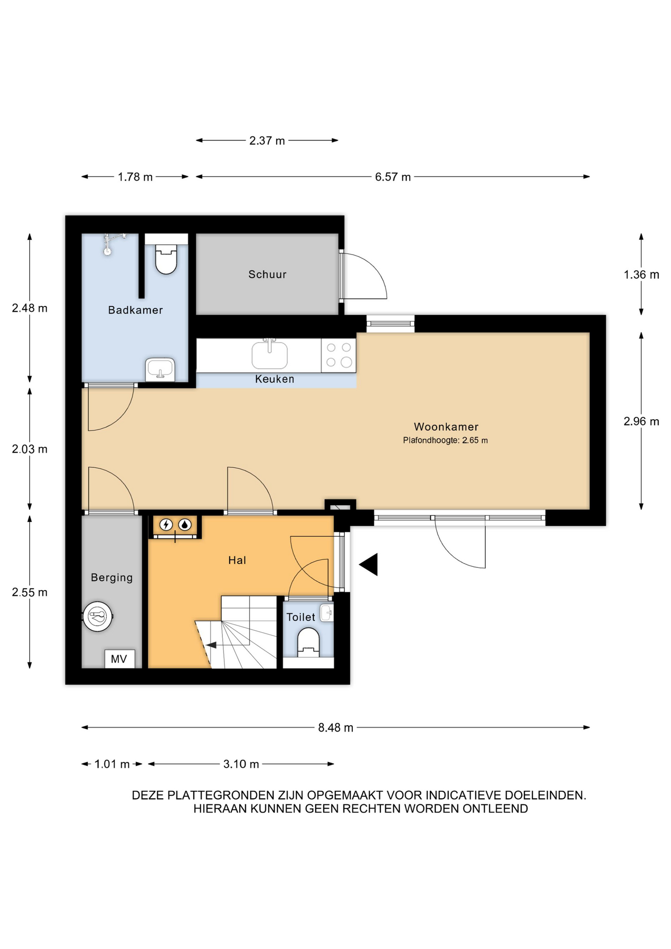 Begane grond: eigen entree – hal met toiletruimte met fonteintje – meterkast – trap naar de 1e verdieping – woonkamer met grote raampartijen en open keuken met inbouwapparatuur – inloopberging/ technischeruimte – badkamer met douchehoek, toilet en wastafel.