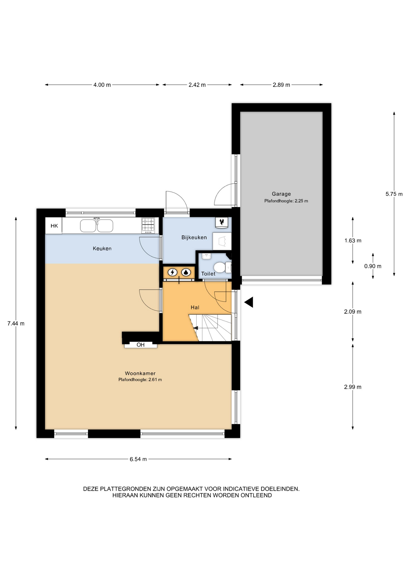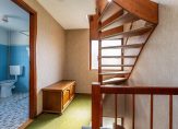 Begane grond: entree/ hal met trapopgang – toilet – L- vormige woonkamer met open haard – open keuken – bijkeuken met wasmachine-aansluiting, CV-opstelling en achteringang.