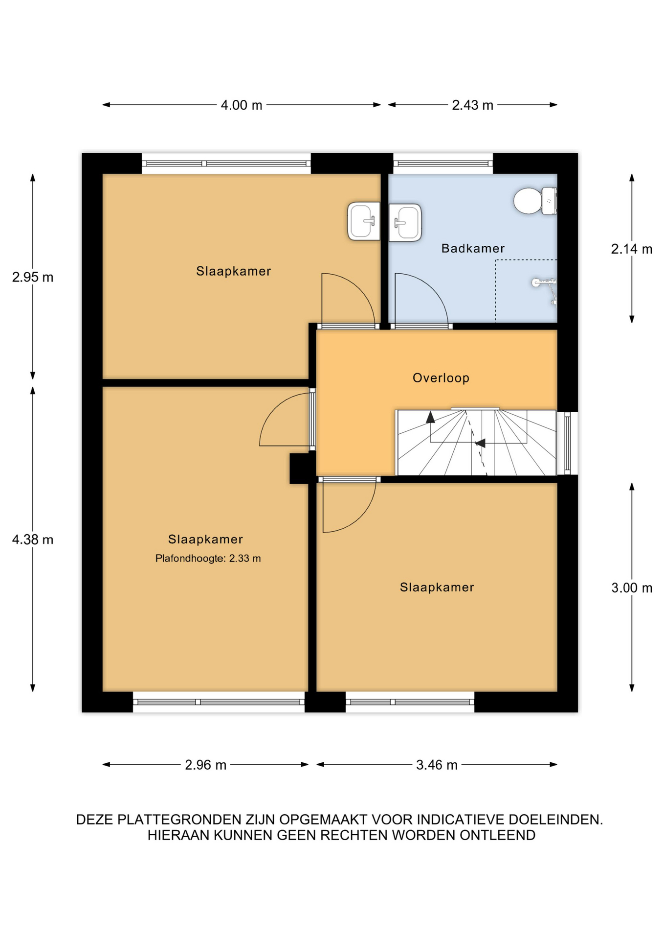 1e Verdieping: overloop – drie slaapkamers – badkamer met douche, wastafel en toilet.