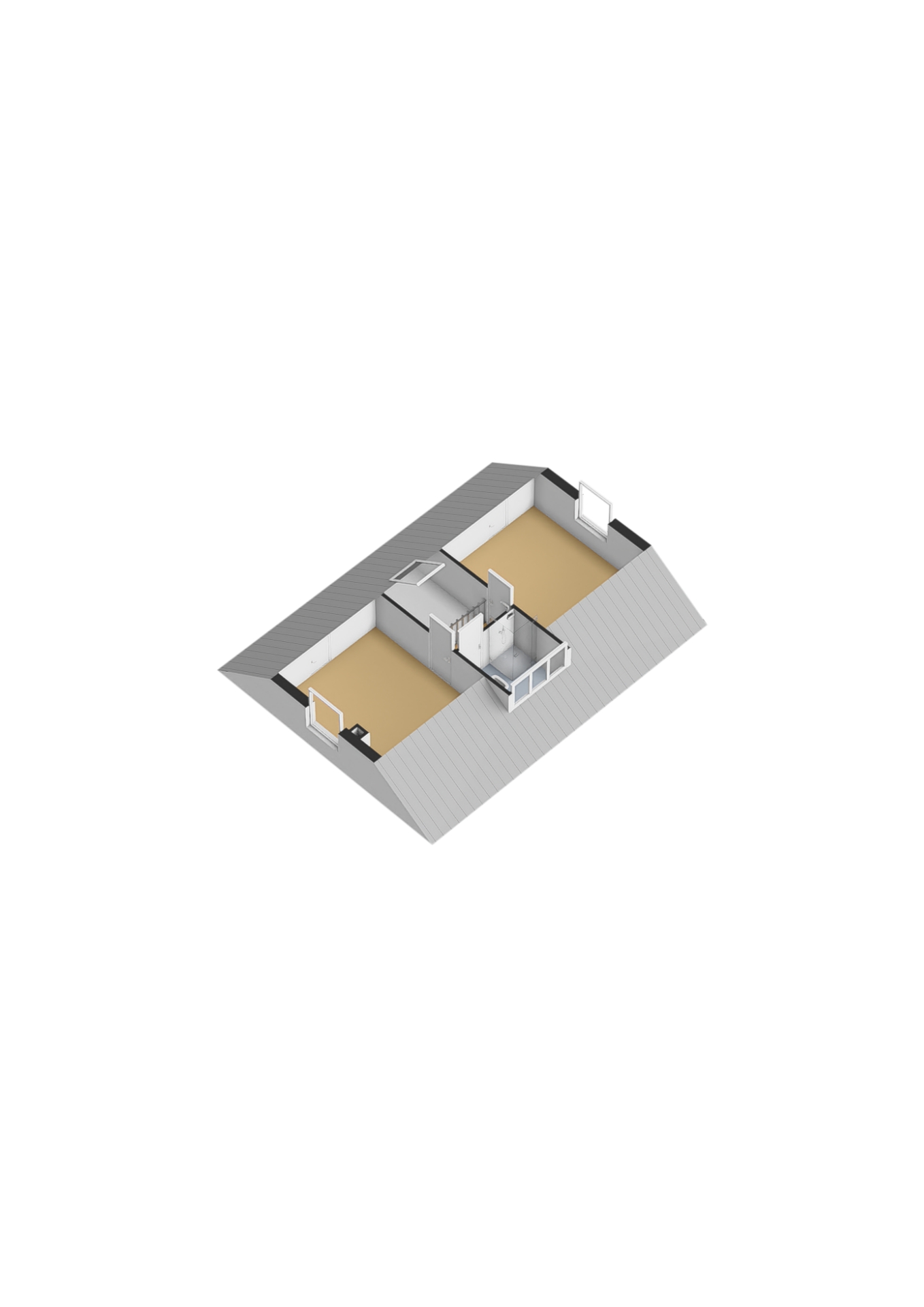 1e Verdieping: overloop – twee slaapkamers met veel bergruimte achter de knieschotten – badkamer met douchecabine en wastafel.