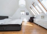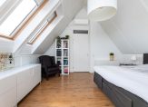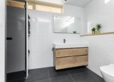 Overloop met toegang tot de slaapkamers en de badkamer. Boven de garage bevindt zich een enorme slaapkamer van maar liefst 23 m²! De beleving van de ruimte wordt versterkt door het hoge plafond dat tot in de nok loopt en de vele dakramen. Verder bevinden zich op deze verdieping nog twee ruime slaapkamers en een praktische bergruimte met de opstelling van de CV en mechanische ventilatie. De luxe en sfeervolle badkamer (2024) is voorzien van: douchehoek met een heerlijke sunshower, 2de toilet en wastafelmeubel.