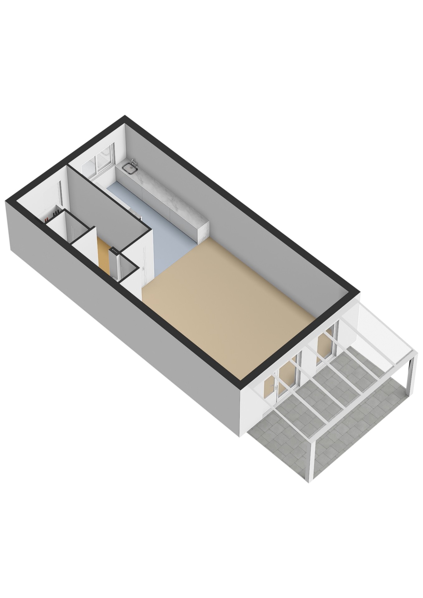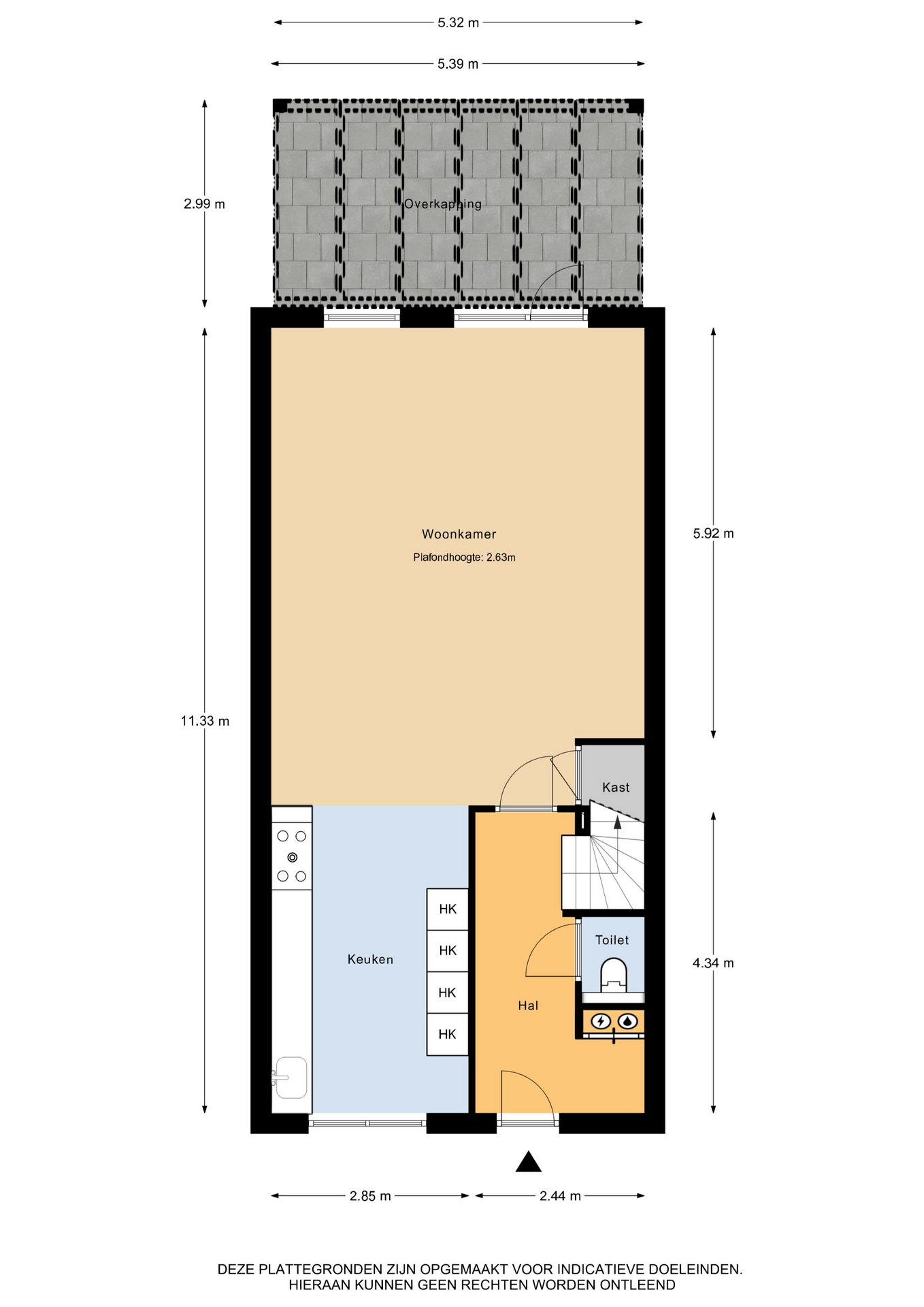 Begane grond: entree/ hal – meterkast – toilet – trapopgang – woonkamer met provisiekast – open keuken.
